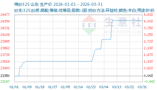 近期纯棉纱市场整体呈现稳中偏弱运行态势,价格保持稳定,但实际成交商谈空间较大,市场分化明显。从区域市场价格来看,新疆地区32s纯棉纱环锭纺价格维持在23100元/吨水平,价格持平,而内地同规格纱线价格稳定在23200元/吨。下游布厂订单持续清淡,补货意愿谨慎,导致部分纺企成品库存小幅上升,市场观望情绪浓厚,对四月份订单预期普遍不乐观。