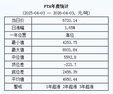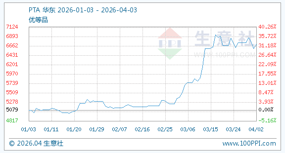 4月3日,生意社PTA基准价为6710.14元/吨,与本月初(6761.93元/吨)相比,下降了0.77%。