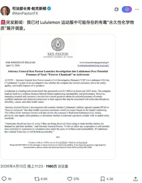 2026 年 4 月 13 日,美国得克萨斯州总检察长肯・帕克斯顿(Ken Paxton)正式宣布对加拿大高端运动服饰品牌 Lululemon(露露乐蒙)发起调查,指控其产品可能含有PFAS(全氟和多氟烷基物质),涉嫌以 “健康、可持续” 为卖点误导消费者。这场风波迅速席卷全球,不仅让 Lululemon 的品牌形象遭遇重创,更引发了公众对运动服饰安全、“永久化学物” 危害的广泛担忧。
